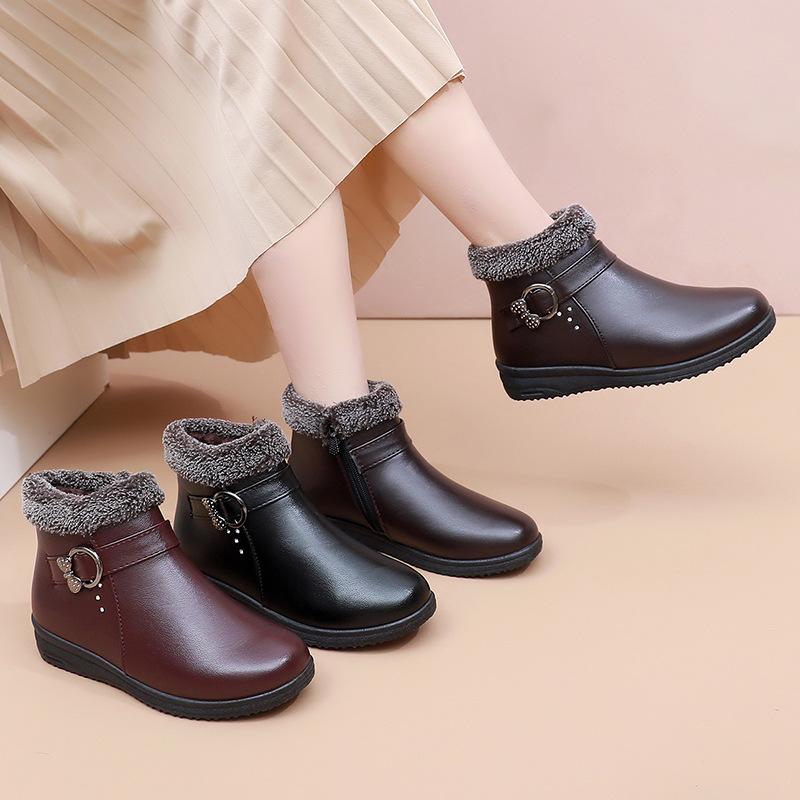 Warm in the elderly cotton shoes women's winter mother shoes fleece non-slip flat sole soft sole comfortable grandma leather shoes lightweight