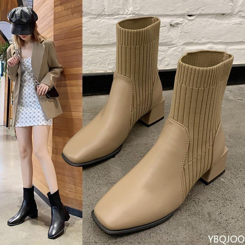 New autumn winter styles with thick medium heels square toe short boots for women knitted boots simple comfortable single boots