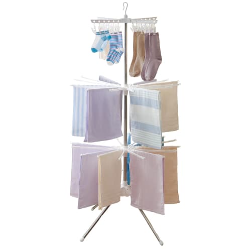 Tenma PS-10K, um estendal de roupa interior tipo suporte que pode secar 32 toalhas de rosto e 12 pares de meias. Montado, uso interno, estilo guarda-sol, 3 níveis