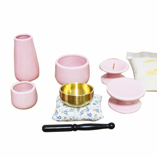 Mini 7-Piece Buddhist Altar Set: Orin (Buddhist Bell), Incense Burner, Incense Ash, Candle Holder, Vase, Teacup, and Offering Stand (Pink)
