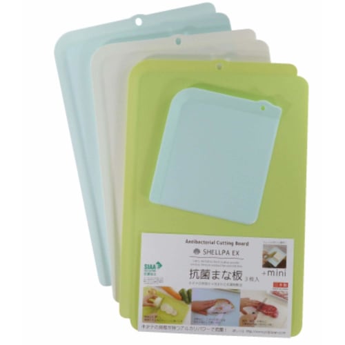 Size: Large 36 x 24 cm, Small 16.5 x 14.5 cm, Material: Polypropylene, Antibacterial agent: Inorganic antibacterial agent (scallop shell calcined calcium) (Sherpa EX antibacterial kneading process) Manufactured in Japan, Set contents: Large x 3, Small x 1 A value and convenient set of 4 antibacterial cutting boards. The large size comes in 3 colors so you can use it differently for fish, meat, vegetables, etc. The small size is palm-sized and convenient for cutting tofu, etc. An antibacterial cutting board containing a safe and secure antibacterial agent derived from scallop shells. O-157 also decomposes and dies. It also sterilizes the inside of knife scratches. This antibacterial cutting board contains an eco-friendly and safe disinfectant made from scallop shells and is safe for food, people, and the environment. It reacts with the moisture in the food and exhibits strong alkalinity on the surface it comes in contact with, demonstrating high antibacterial performance. Since it is kneaded into resin, it disinfects even the inside of knife wounds.