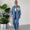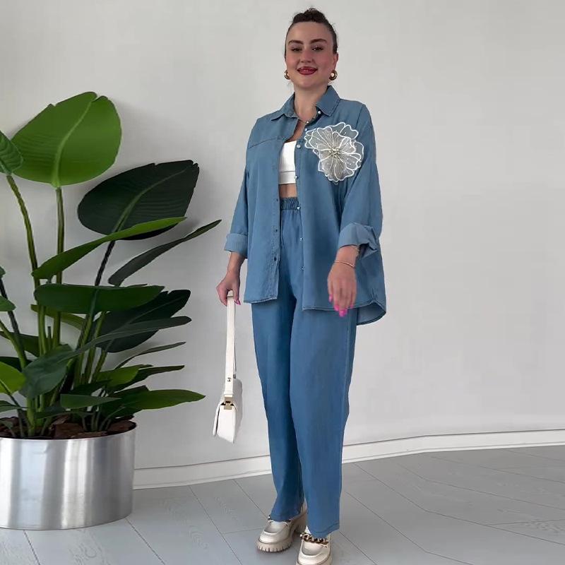 2024 Autumn Women's Distressed Water System Fashion 3D Applique Casual Long Pants Set