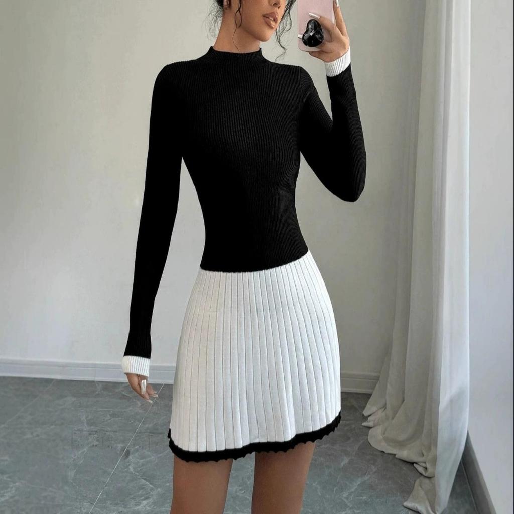 Eleve o seu guarda-roupa com este elegante vestido-suéter, desenhado para oferecer uma silhueta emagrecedora através do seu padrão patchwork habilmente trabalhado.. Confeccionado com materiais de viscose de alta qualidade, este vestido promete conforto e versatilidade, tornando-o perfeito para várias ocasiões. O design contrastante em preto e branco adiciona um toque de sofisticação, enquanto o detalhe da gola redonda realça o seu apelo clássico.. Ideal para dias mais frescos, este vestido combina sem esforço estilo e funcionalidade.