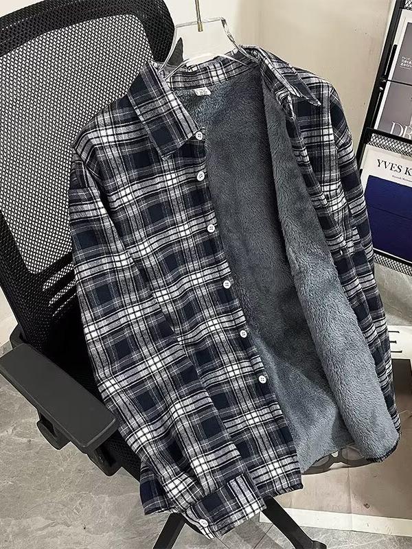 Camisa Xadrez Masculina Forrada com Lã - Jaqueta Casual Retrô de Manga Comprida para Outono/Inverno