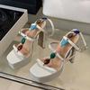Fashion Design Colour Gem Ankle Strap Women Chunky Platform Sandals Summer Square Toe Super High Heels Wedding Prom Shoes