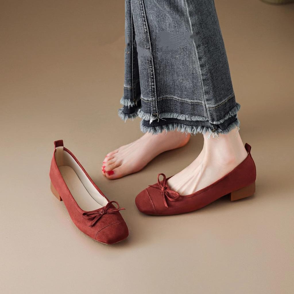 Leather version! Half-song red ballet single shoes women's bow retro flat-bottomed laden shoes square head shallow mouth grandma shoes