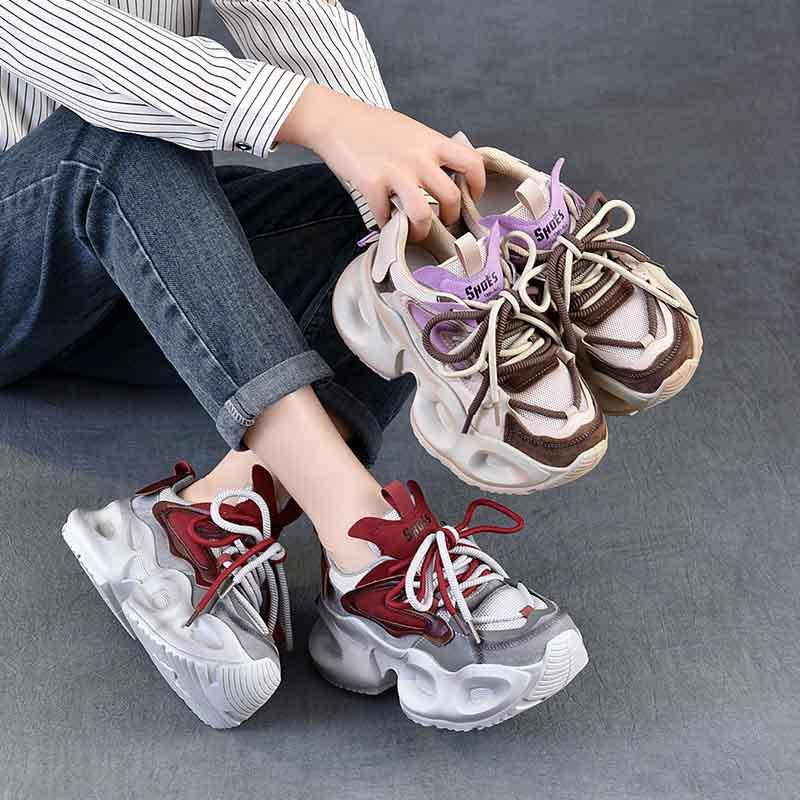 Moda 6CM Couro de Camurça Mesh Aérea Marca Alta Plataforma Anabela Primavera Verão Mocassim Vulcanizado Mulher Tênis Chunky Sapatos Respiráveis