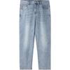 Discover the HLA Men's SPRINTING SMILE Series Tapered Cropped Jeans, perfect for everyday summer wear. These youth-oriented casual jeans feature a modern tapered fit and a comfortable nine-point length. Made from slightly stretchy denim, they offer ease of movement. Details include a zipper closure, natural waist, a subtle letter pattern, and stylish stitching, all in a versatile light blue-gray transition color.