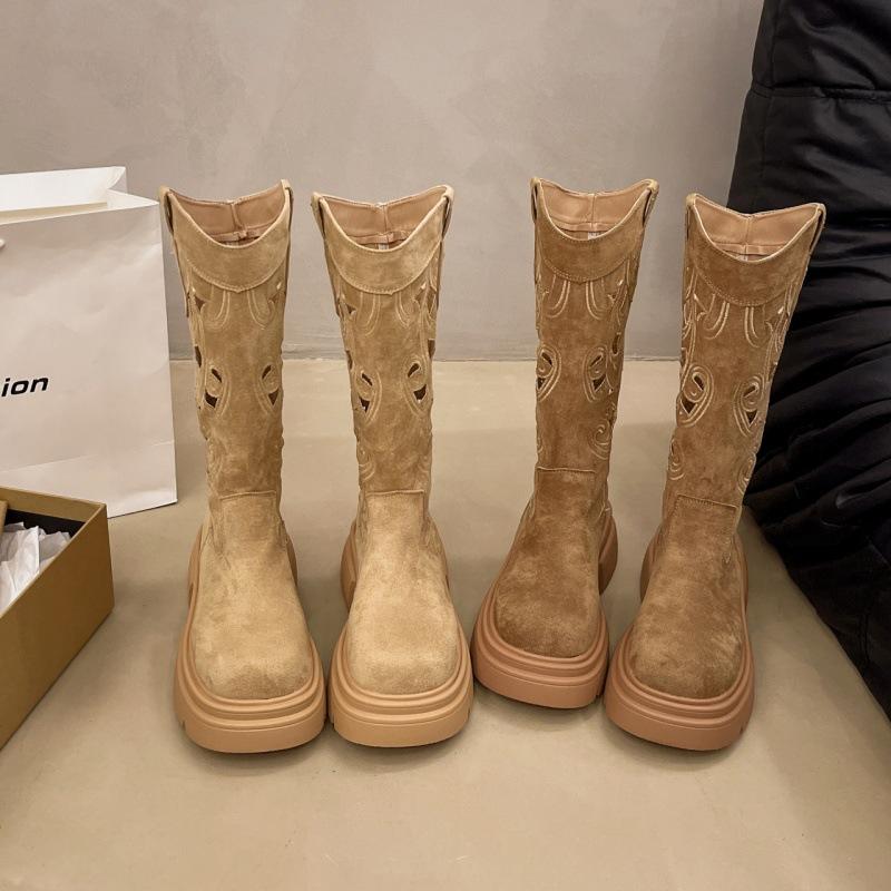 Retro British style hollow western cowboy high boots boots 2025 spring and autumn women's thick bottom but knee v mouth