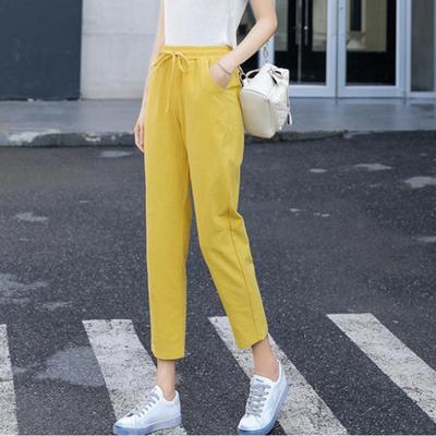 Peça dois tamanhos acima, calças femininas casuais de verão soltas, harém, cintura elástica, algodão, linho, calças finas, nona calça