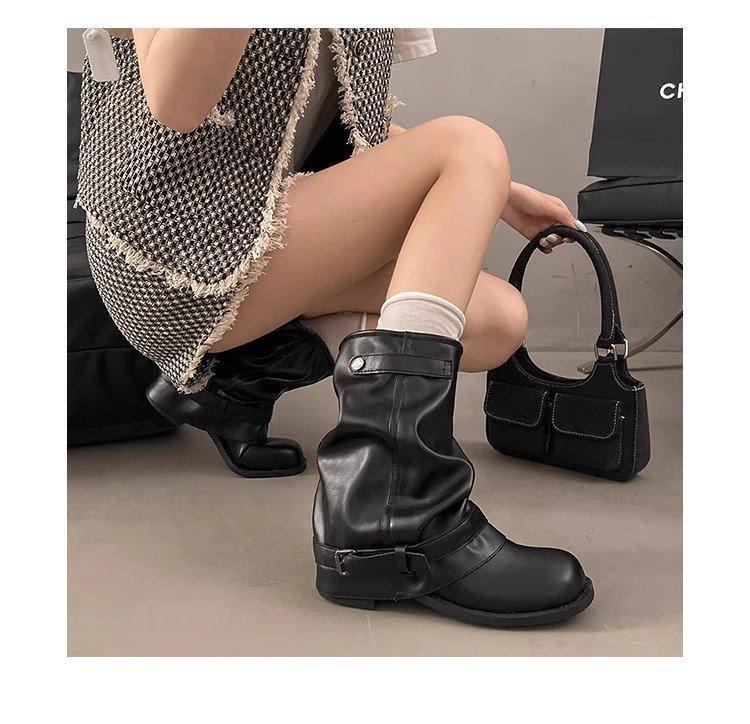 Western cowboy boots women's 2025 summer new pleated pile black round head retro leather thick heel knight boots women