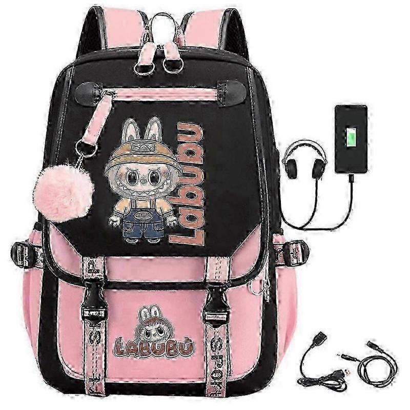 Mochila com Carregamento USB Labubu - Mochila Escolar Divertida de Desenho Animado para Crianças e Adultos