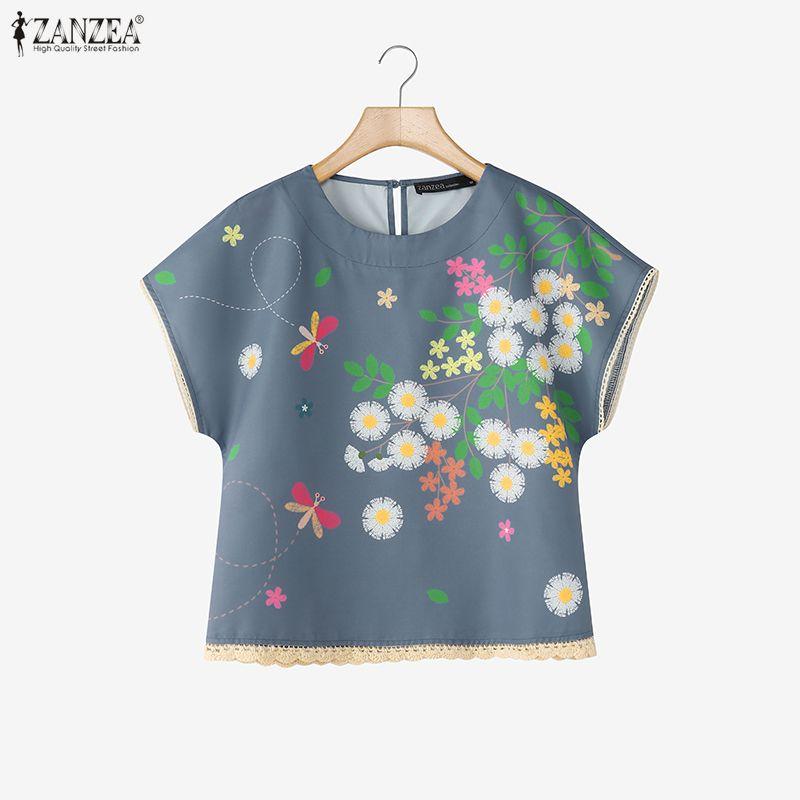 ZANZEA Blusa feminina casual de verão com decote redondo e manga curta floral