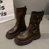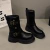 Step into timeless style with these mid-calf, thick-soled motorcycle boots, designed for the 2025 autumn and winter season. Crafted with a durable polyurethane upper, these boots offer a vintage British flair that's perfect for any wardrobe. The rubber sole ensures sturdy footing, while the artificial leather lining adds a touch of luxury and comfort. Ideal for fashion-forward women, these boots blend retro appeal with modern sensibility, making them a must-have for cooler weather fashion.