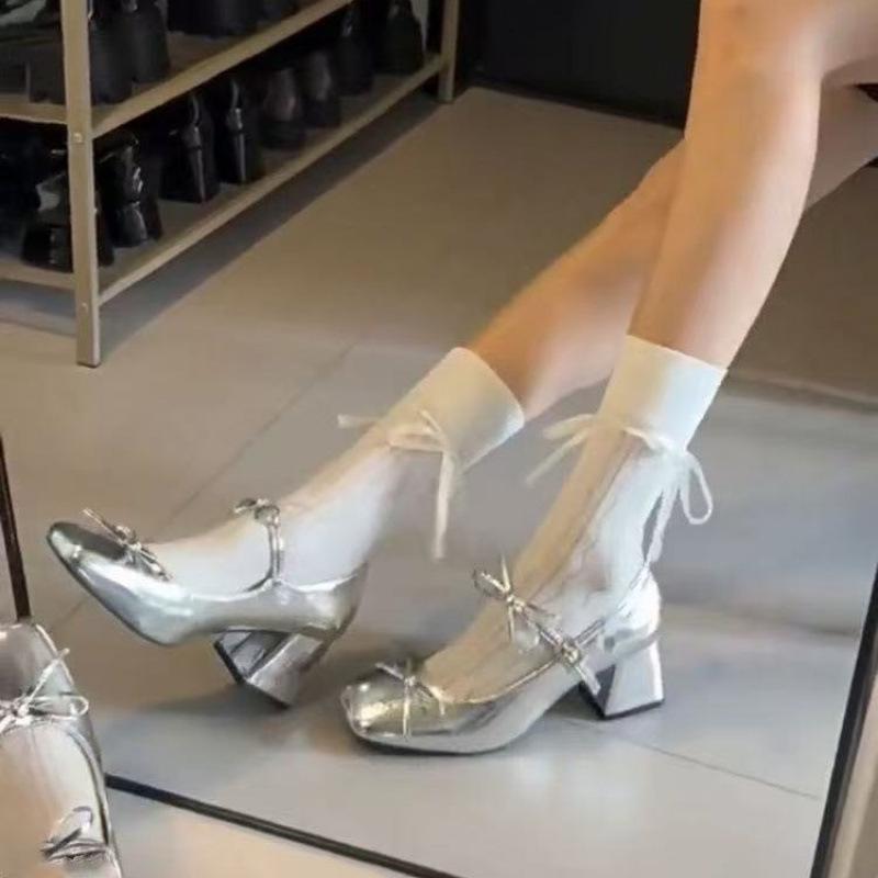 2025 New Versatile Silver French Bow Mary Jane Skirt Shoes - Women's Chunky Heel Spring Edition