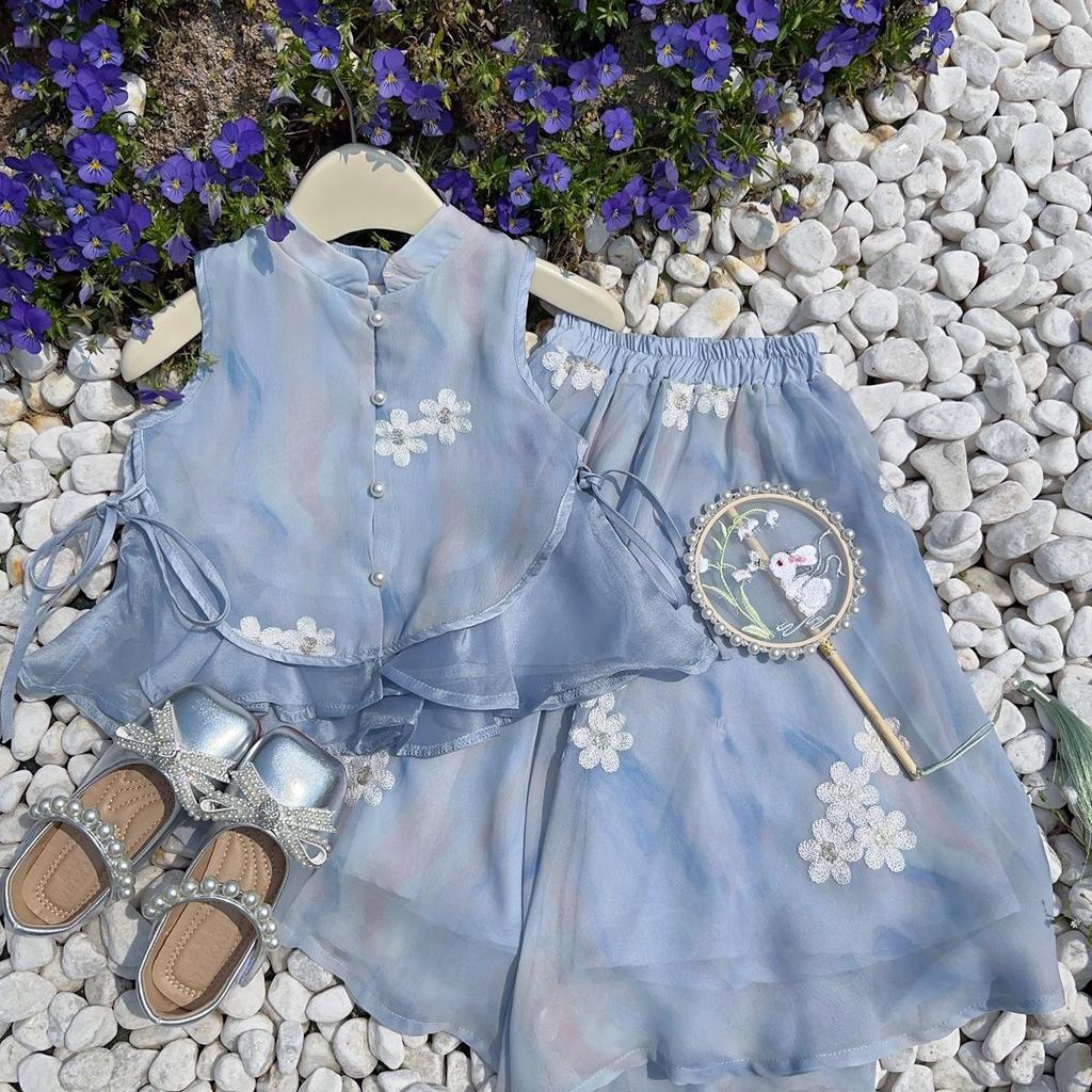 This charming two-piece set is designed for summer, featuring a hanfu-style vest and matching pants. Made from soft and durable corduroy, it offers a comfortable and breathable fit. The design beautifully combines traditional elegance with modern style, making it perfect for various occasions. Ideal for girls who appreciate both fashion and comfort.
