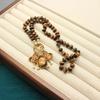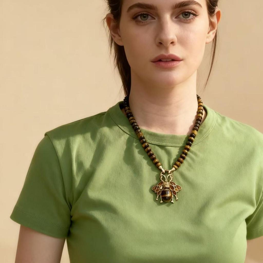 Colar Corrente de Suéter Vintage Destacável com Pedra Olho de Tigre Natural e Pingente de Abelha