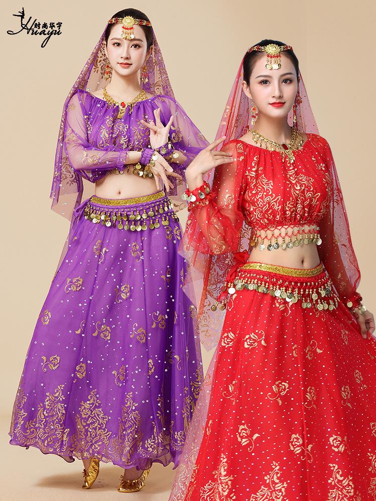 Fantasia de Apresentação de Dança do Ventre Indiana Huayu - Conjunto de Vestido de Manga Comprida de Chiffon para Mulheres