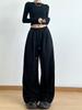 Women's Black High-Waist Flare Sweatpants - Spring/Autumn, Slimming, Casual, Floor-Length with Drawstring and Drape, Horseshoe Design.