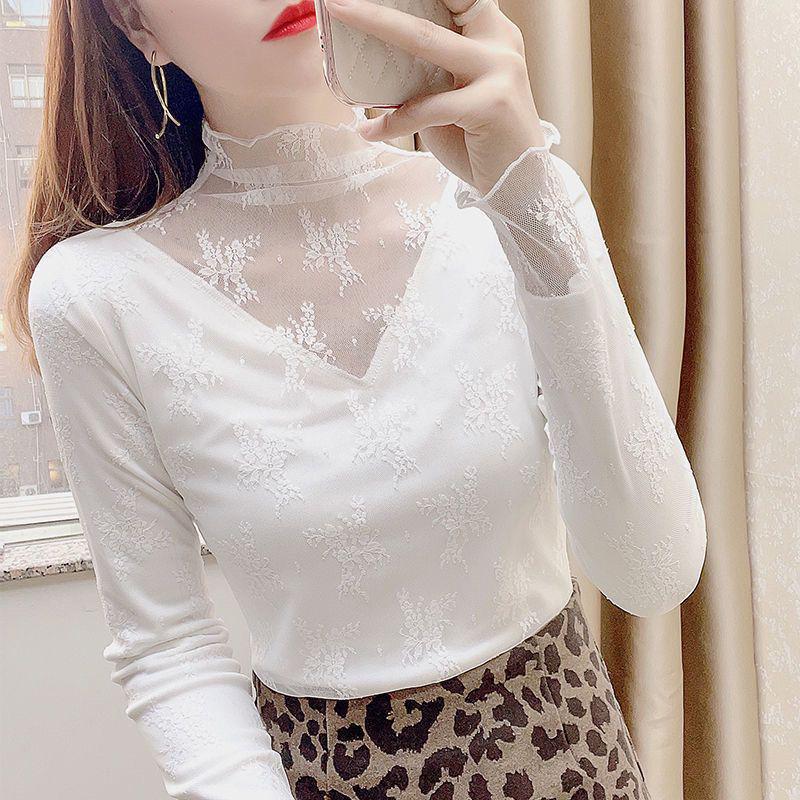 Blusa de Gaze com Renda de Gola Alta Outono/Inverno - Elegante Suéter Interno de Malha Branca