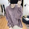 Camisa de Algodão de Manga Comprida Tops de Primavera e Outono Camisa Básica Retro com Gola Babados em Imitação de Algodão e Linho Camisa Feminina