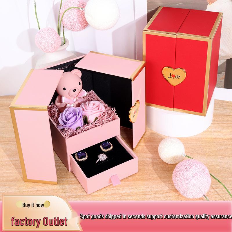 Caixa de Presente Ursinho Porta Dupla: Rosa Preservada e Gaveta de Joias para Aniversários e Dia dos Namorados