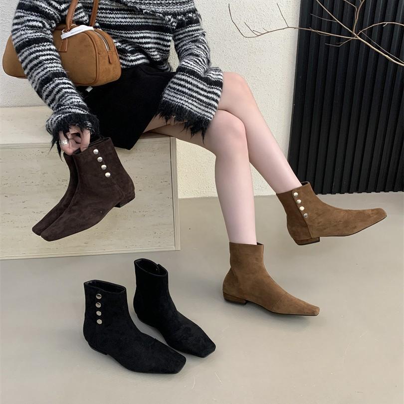 Women's shoes real shot suede square head side zipper thick heel small short boots elastic boots Martin boots thin boots comfortable
