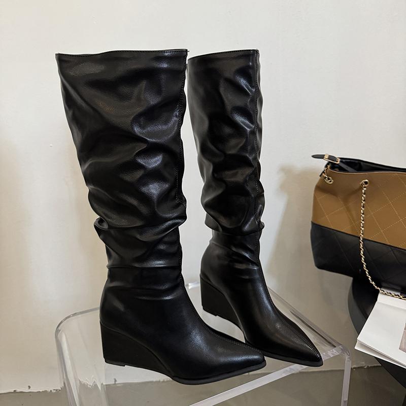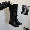 Vintage Pointed Toe Women Pleated High Boots Patent Leather Shoes Wedges High Heels Party Autumn Winter Ladies Long Booties