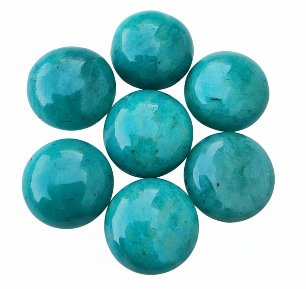 Estes Cabochões Redondos de Amazonita Verde Natural distinguem-se pelos seus tons mesmerizantes de verde frio a turquesa, incorporando as cores calmantes das águas tropicais.. Classificadas como Grau AAA, estas pedras preciosas ostentam saturação de cor superior, inclusões mínimas de matriz e um acabamento excepcional de Alto Polimento que realça seu sutil brilho sedoso.. Disponíveis numa vasta gama de Todos os Tamanhos, a sua forma redonda clássica torna-os perfeitamente versáteis para uso em joalheria bespoke de alta qualidade, incluindo anéis, brincos e engastes de pingentes.. A estética única da amazonita torna cada peça uma declaração tranquila e elegante.