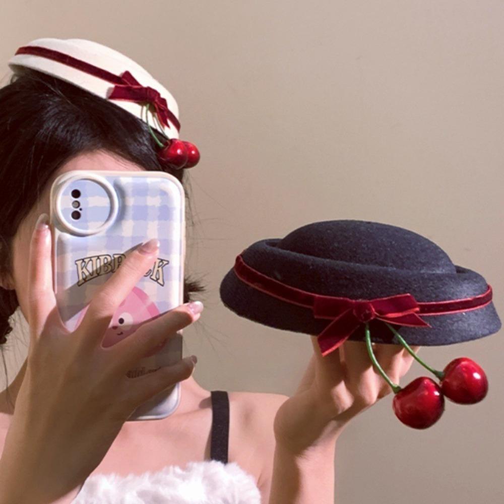 Headdress Round Hat Hair Clip French Style Women Hairpin Vintage Cherry Hat Hairpin Photography