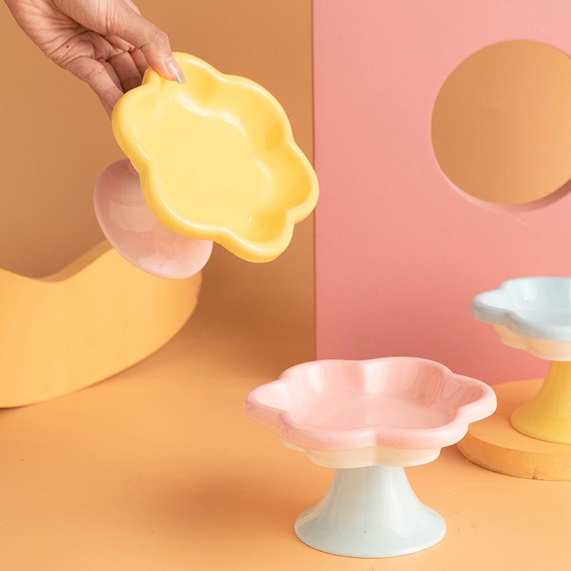 Ceramic Elevated Cat Bowl With Stand For Neck Protection, Raised Flower Design Food Water Plate Snack Dish