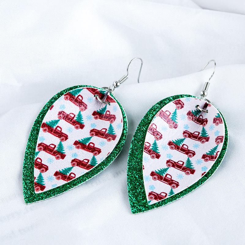 European & American Christmas Tree Red Car Sequin Leather Earrings - Holiday Style Leaf Design