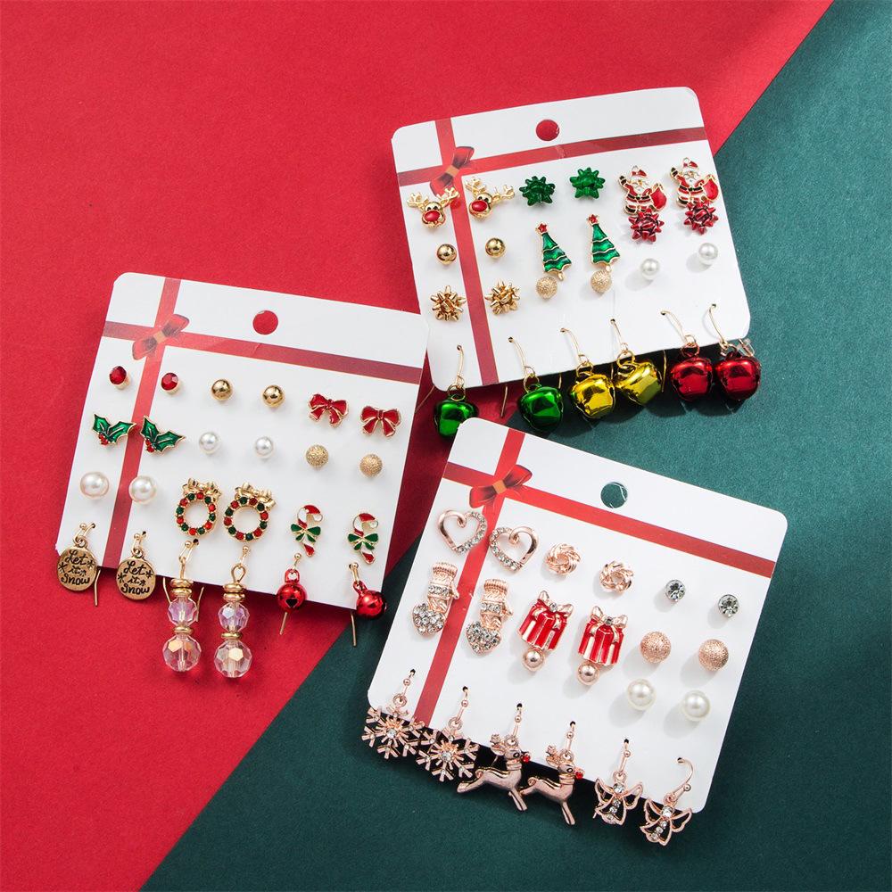 Christmas Earring Set: Santa Claus, Bell, and Tree Drop Oil Studs - 12-Piece Gift Collection