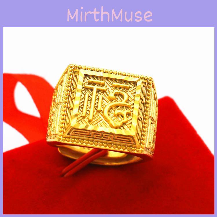 The ring features a square shape, enhanced with intricate engravings of auspicious symbols such as '' (Fortune), '' (Wealth), and '' (Prosperity). Each element has been thoughtfully integrated into the design, making it a meaningful addition to your collection. The golden finish gleams with every movement, drawing attention to the wearer and adding a touch of sophistication to any outfit. Whether you're dressing for a business meeting or a casual outing, this ring complements various styles, embodying a blend of contemporary fashion and traditional symbolism.