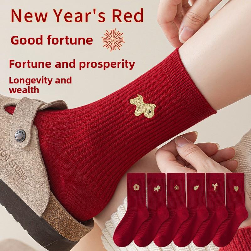 Embroidered Red Socks for Autumn and Winter, Bright Red New Year Warm Mid-calf Women's Socks, Winter Wedding Socks