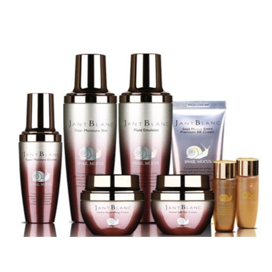 The Jean Blanc Snail Mucin Skincare 8-Piece Set is a complete nourishing and repairing routine formulated with concentrated snail mucin to improve hydration, elasticity, and overall skin smoothness. This intensive multi-step system includes toner, emulsion, essence, cream, eye cream, BB cream, and travel-size minis, offering deep moisture, wrinkle-care benefits, and natural radiance. Perfect for those seeking a full basic-to-intensive skincare solution with repair-focused ingredients.