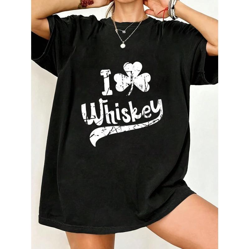 Oversized T Shirt Black I Love Whiskey With Clover Print Casual Streetwear For Women Party And Daily Wear