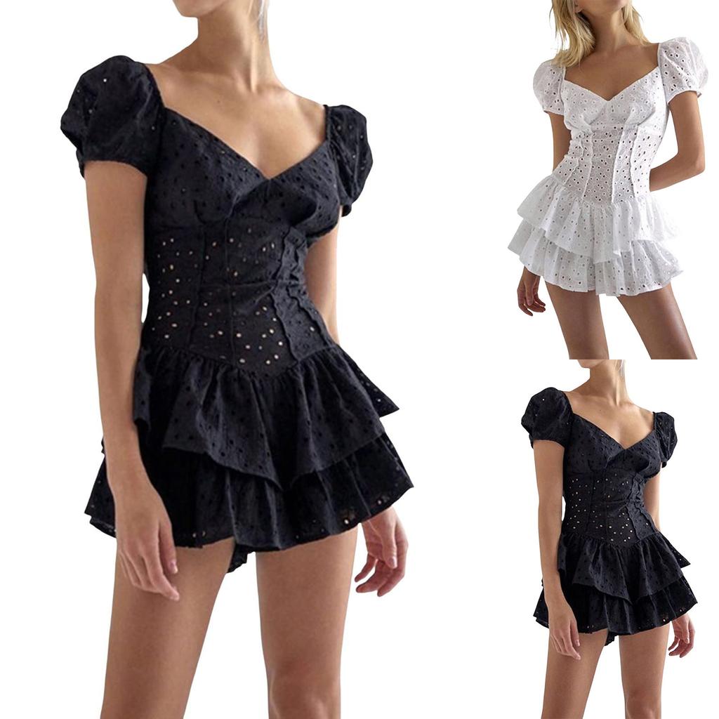 Women's Fashion Sexy Hollow Square Neck Bubble Sleeve Double Layer Dresses