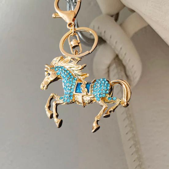 Available in a variety of colors including blue, red, purple, and pink, our keychain offers a range of styles to suit every taste. The eye-catching horse-shaped design is embellished with colorful rhinestones that catch the light beautifully. The golden metal outline accentuates the dynamic posture of the galloping horse, making it a visually striking accessory.