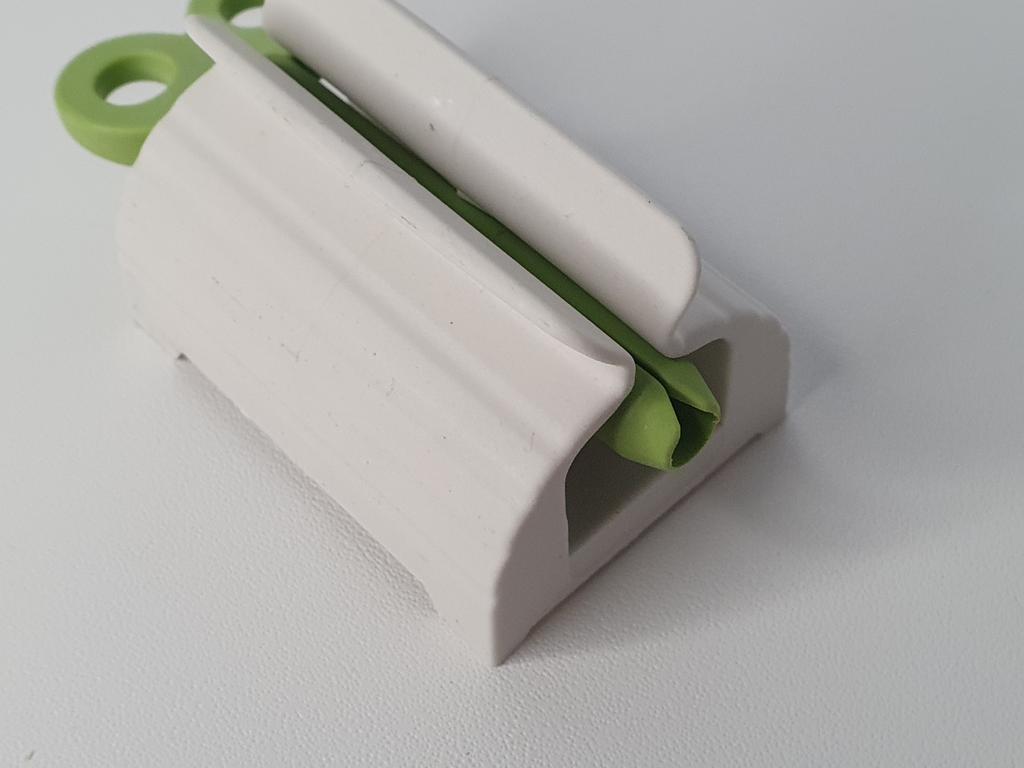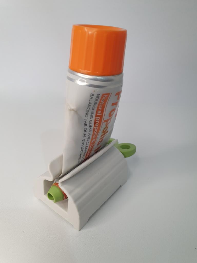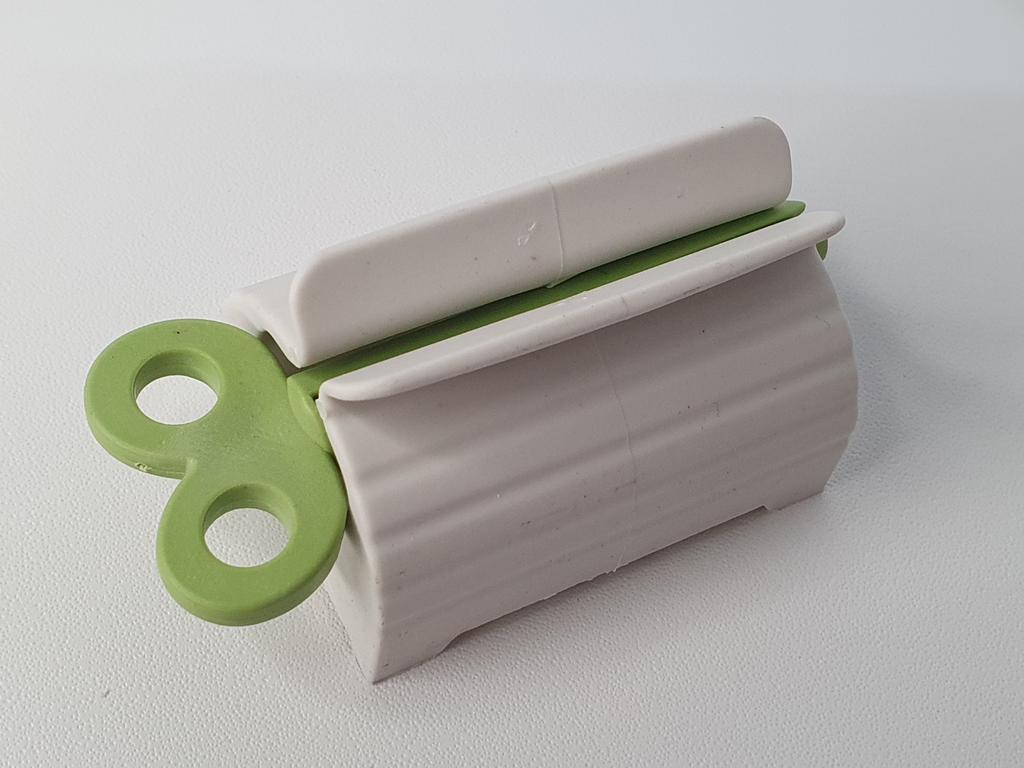 Este espremedor de tubo de pasta de dente é uma daquelas invenções que parecem insignificantes até você usá-lo e perceber quanto produto estava desperdiçando. É a solução definitiva para quem odeia ver o tubo todo amassado e danificado na pia.. O design é super simples: consiste em uma base branca e uma torneira verde. Basta deslizar a ponta do tubo na ranhura da torneira e, ao girá-la, o tubo se enrola uniformemente. O que mais gosto é que aplica pressão constante, empurrando até a última gota de pasta de dente para o bico, permitindo usar 100% do conteúdo sem qualquer complicação. Além disso, mantendo o tubo na vertical e organizado, o banheiro fica muito mais limpo. É um acessório barato, durável e extremamente prático que se paga com a economia de pasta de dente a longo prazo.