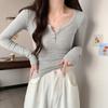 Simple solid color U-neck button slim-fitting long-sleeved T-shirt spring femininity