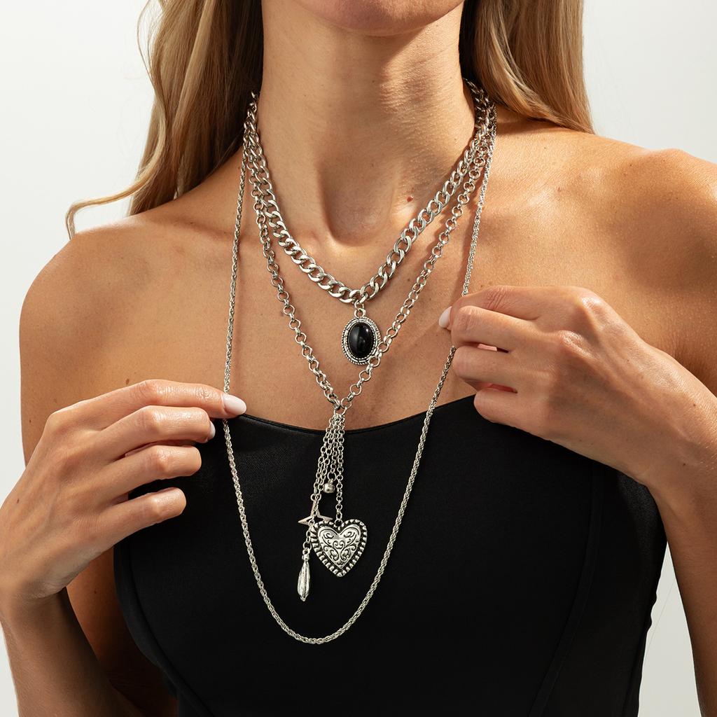 Fashion Stone Heart Star Pendant Necklace Punk Retro Multilayer Choker Couple Necklaces Jewelry for Romantic Valentine's Day Gifts