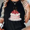 Camiseta Oversized Preta Creme Estampa de Sobremesa Cupcake e Bolo com Citação Engraçada Roupa Casual para Mulheres Looks de Verão Moda Streetwear