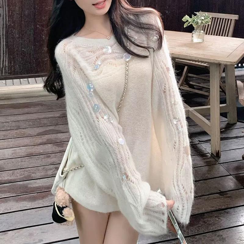 Female Clothing Solid Color Hole Pullovers Knitted Fashion Sequined Autumn Loose Basic Long Sleeve Casual Round Neck Sweaters