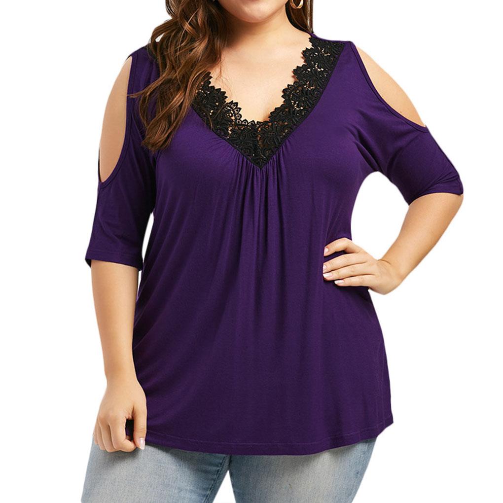 Women Crochet Stitching Cold Shoulder V Neck Short Sleeves Blouse