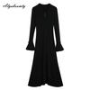 Vintage Chinese Style Women Black Midi Sweater Dress V Neck Hollow Out Knitting Warm Irregular Dress Flare Sleeve Knitted Warm Dress