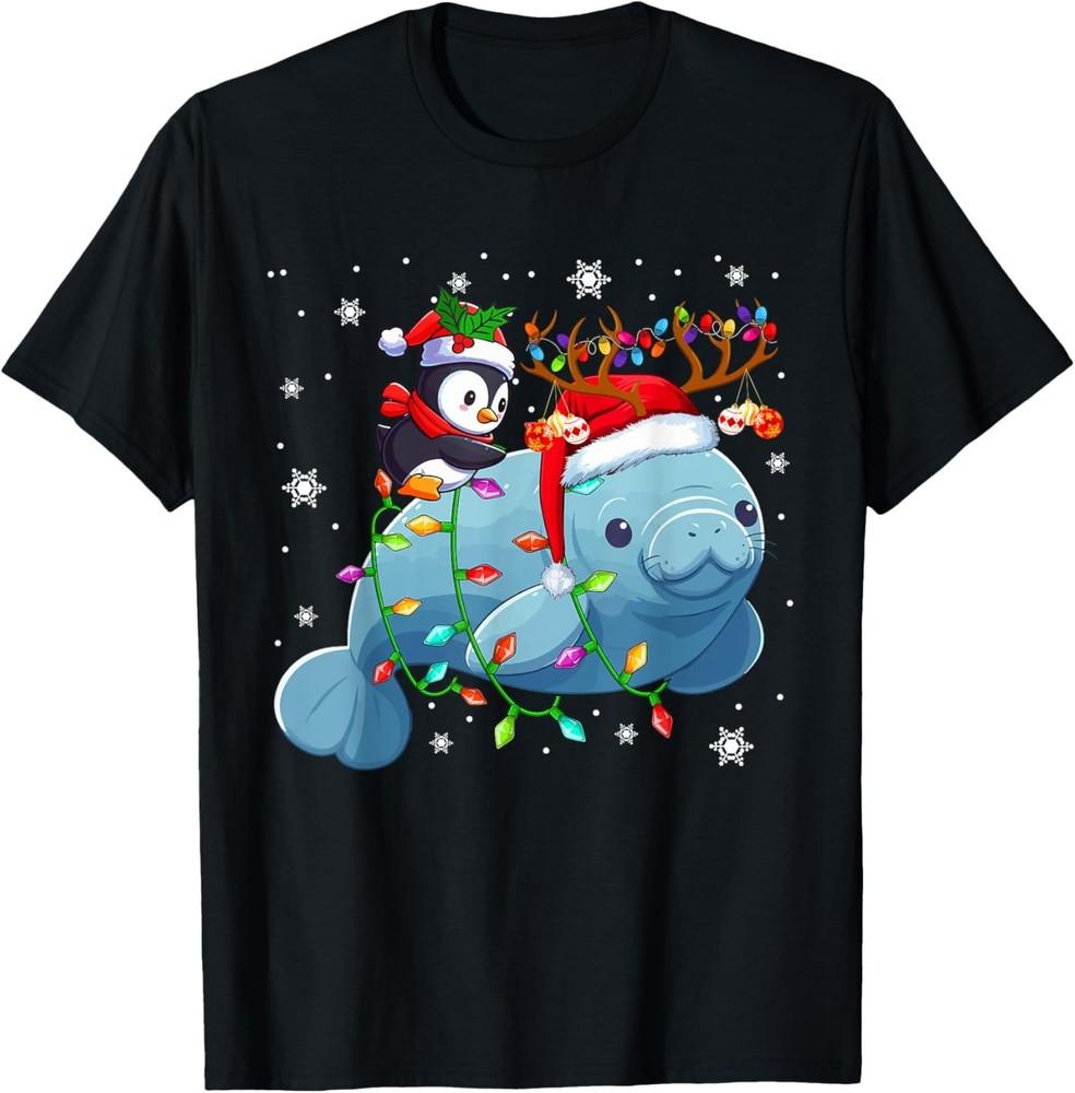 Santa Penguin Riding Reindeer Manatee Christmas Sea T-Shirt