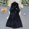 French Nail Bead Three-dimensional Flower Turn-down Collar Long Sleeved Single Breasted Strap Waist Cinching Dress for Women