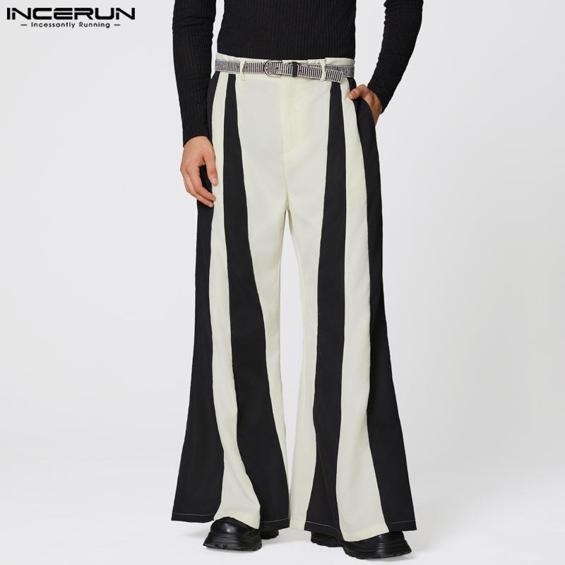 INCERUN Men's High Zipper Waist Striped Patchwork Casual Long Flare Pants Trousers