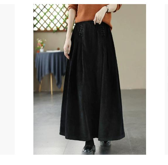 Women Vintage Corduroy A-Line Skirts Elastic Waist Solid Color Patchwork Pockets 2025 Spring New Thick Women Skirts